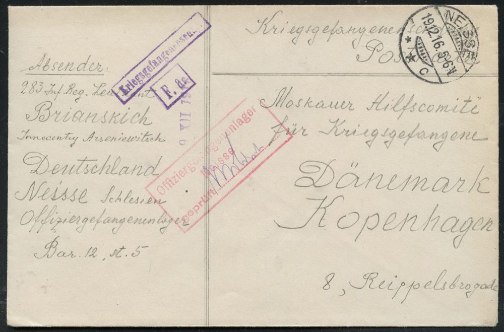 840 | 18 € | I. WELTKRIEG: KRIEGSGEFANGENENPOST 1914-18 : NEISSE/ **c 1917 (12.1.) 1K-Brücke + roter Zensur-Ra.3 : Offiziersgefangenenlager/Neisse/geprüft...... (Wo. unbekannt !) + Name hs. + viol. Ra.: Kriegsgefangenensdg. + F.a. klar gest. Ausl.-Kgf.-Bf. nach Kopenhagen | ![]() | |