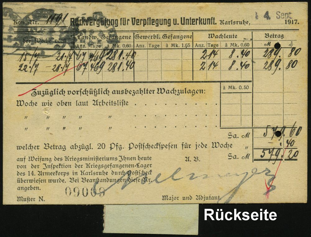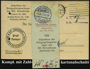 835 | 30 € | I. WELTKRIEG: KRIEGSGEFANGENENPOST 1914-18 : KARLSRUHE/ *(BADEN)1 1917 (3.9.) 1K-Steg auf Vordr-Kt: Inspektion der Kriegsgefangenen-Lager des XIV. Armeekoprs . rs.Vordr.(2 kl. Reg.-Lochungen, etw. fleckig) Rückvergütung für Unterkunft etc. (Helmstadt) + PSch-Abschnitt mit blauem 1K-Steg: KARLSRUHE/(BADEN)/ *SchA/d, 2 Belege kompl., sehr selten! | ![]() ![]() | |