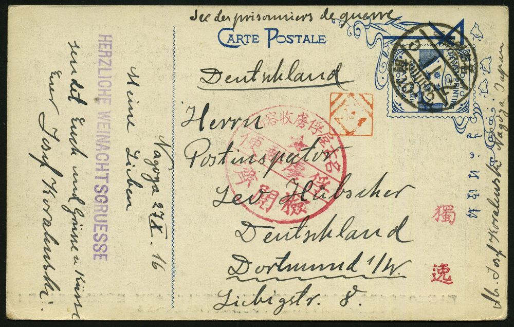 848 | 40 € | I. WELTKRIEG: KRIEGSGEFANGENENPOST 1914-18 : JAPAN / DEUTSCHES REICH 1916 (27.10.) Kriegsgef.-Lager Nagoya, schw. 1K + roter Zensur-1K mit Stern etc. (Wo.10) + viol. 1L: HERZLICHE WEIHNACHTSGRÜSSE, seltene Übersee-Kgf.-Ak. (n. Dortmund) | ![]() ![]() | |
