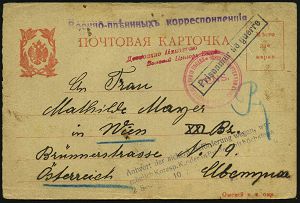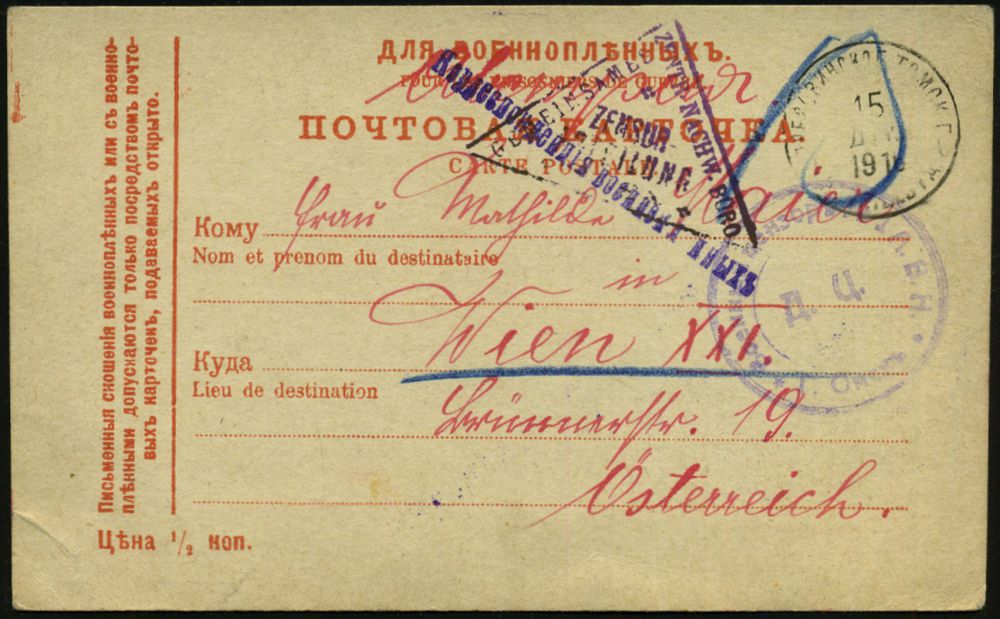 849 | 14 € | I. WELTKRIEG: KRIEGSGEFANGENENPOST 1914-18 : RUSSLAND 1915 (23.2.) Kgf.-Kt. aus Lager Tobolsk, eines österr. Kgf., 2 viol. Zensur-1 bzw. 2L + roter Eingangs-Zensur-2K: ZENS./GESELLSCHAFT VOM ROTEN KREUZ... (= Wien, Wo.1 c) n. Wien | ![]() | |