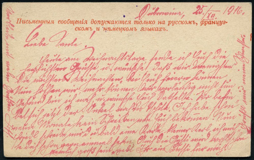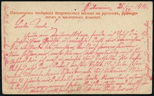 851 | 12 € | I. WELTKRIEG: KRIEGSGEFANGENENPOST 1914-18 : RUSSLAND / ÖSTERREICH 1916 (25.12.) russ. 1K: TOMSK + viol. Lager-Zensur-2K: OMSK (Wo.2) + viol. 1L + viol. Eingangs-Zensur-Dreieck: ZENSUR-/ABTEILUNG/WIEN (Wo.1 a, viol.) Kgf.-Doppel-Zensur-Kt. n. Wien | ![]() ![]() | |