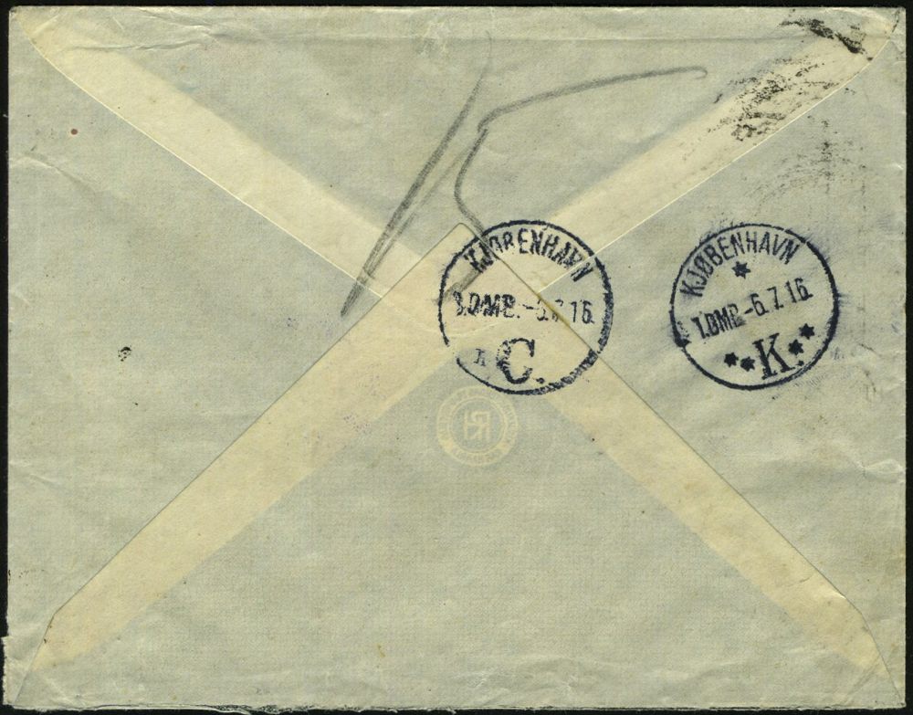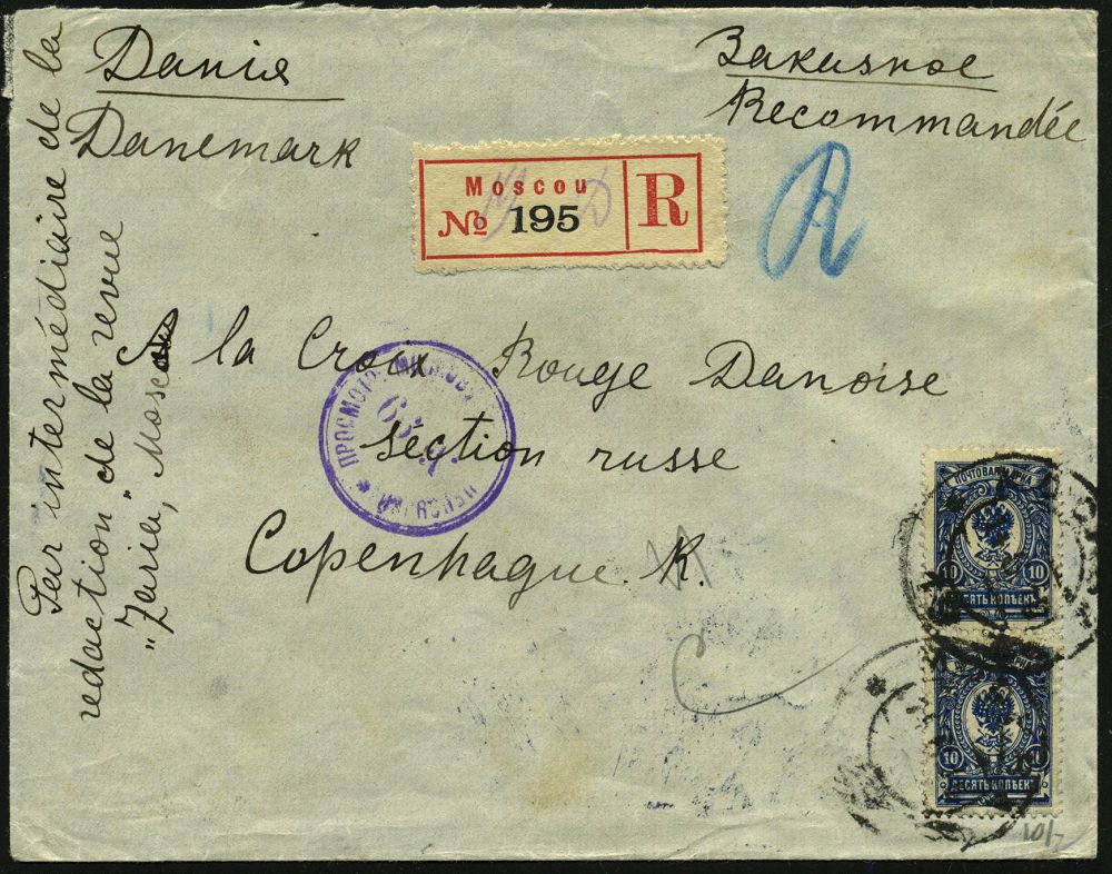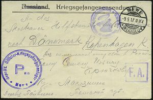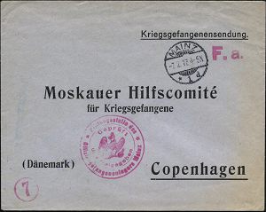 850 | 25 € | I. WELTKRIEG: KRIEGSGEFANGENENPOST 1914-18 : RUSSLAND 1916 (25.6.) 10 Kop. Freimarke, blau, MeF = Paar, 2K + gez. RZ: Moscou = nur R-Gebühr frankiert!, viol. Zensur-2K: MOSKAU No.99 (Wo.11 a) Ausl.-Zensur-R-Bf. an Dänisches R.K., rs. AS (Mi.69 MeF) | ![]() ![]() | |