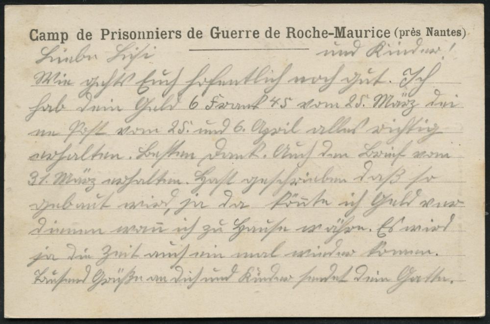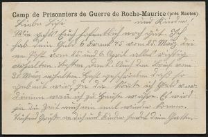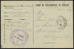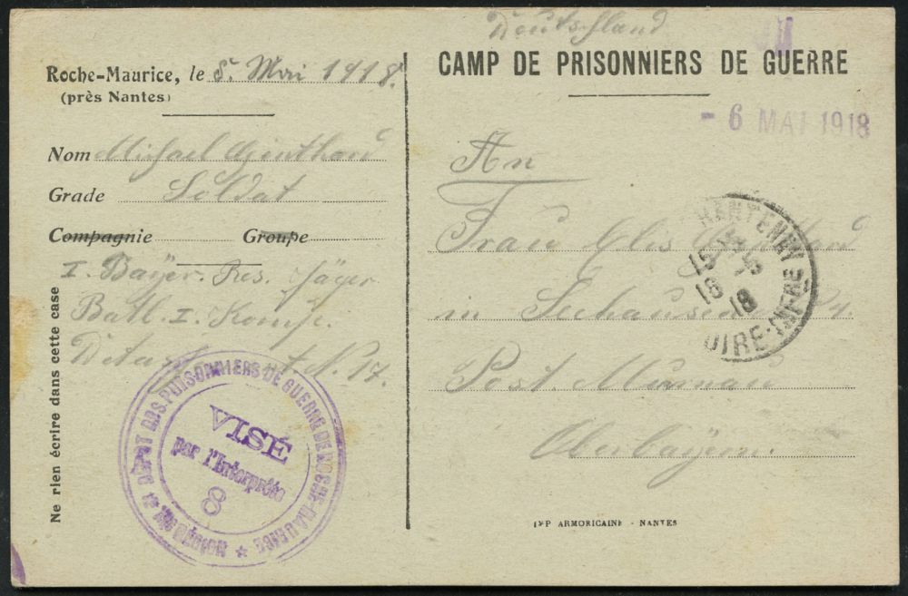 844 | 12 € | I. WELTKRIEG: KRIEGSGEFANGENENPOST 1914-18 : FRANKREICH 1918 (18.5.) 1K: NANTES-CHANTENAY/LOIRE-INTre + viol. Zensur-3K-HdN: VISÉ/par l´Interprête/6/DEPOT DES PRISSONNIERS DE GUERR../XIe Région = Dolmetscher-Zensur (Wo.45 ) Kgf.-Vordr.-Kt.: Camp de Prisonnier de Guerre de Roche-Maurice eines deutschen Kgf. (Bayer. Jäger-Batl.) n. Murnau | ![]() ![]() | |