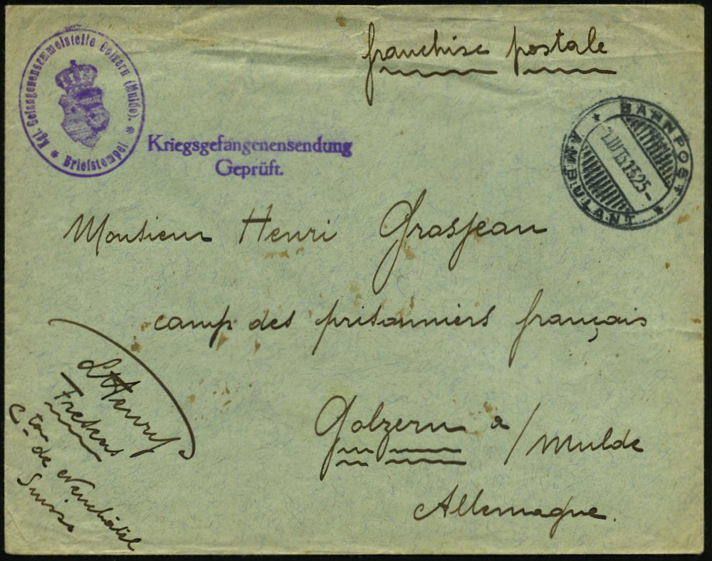 853 | 15 € | I. WELTKRIEG: KRIEGSGEFANGENENPOST 1914-18 : Golzern/ Mulde 1915 (1.3.) schweizer 2K-Gitter: BAHNPOST/1525/AMBULANT + viol. Eingangs-Zensur-2L: Kriegsgefan-genensendung/Geprüft + Oval-HdN: Kgl. Gefangenensammelstelle Golzern (Mulde) (Wo.48) Kgf.-Zensur-Bf. an französ. Kgf. | ![]() | |