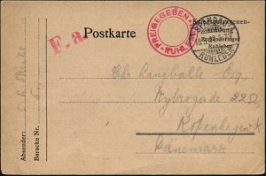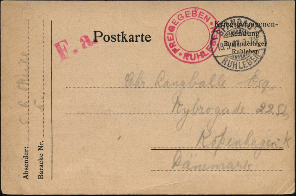 823 | 18 € | I. WELTKRIEG: KRIEGSGEFANGENENPOST 1914-18 : Berlin-Ruhleben 1917 (18.5.) 1K-Gitter: SPANDAU-/RUHLEBEN + roter 2K: FREIGEGEBEN/RUHLEBEN + F.a. (= Fristgemäß abgefertigt) zweisprachige Lager-Vordruck-Kt.: ..Engländerlager Ruhleben n. Kopenhagen (Wo.121 d) | ![]() ![]() | |