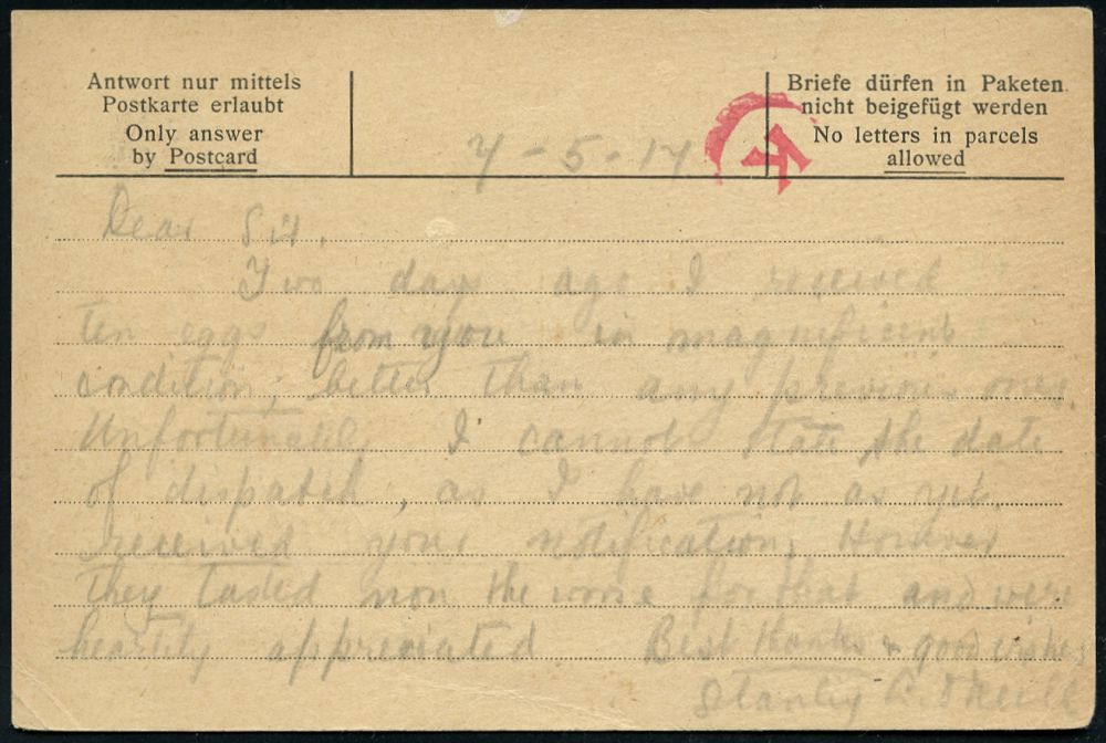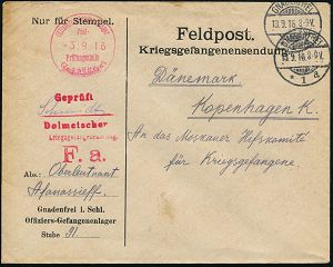 834 | 20 € | I. WELTKRIEG: KRIEGSGEFANGENENPOST 1914-18 : GNADENFREI/ *1a 1916 (13.9.) 1K-Gitter + roter Zensur-1K: Gnadenfrei/Offiziersgefangenenlager/Prüfungsst + roter 3L: Geprüft/___/Dolmetscher (+ Name) + roter 2L: Kriegsgefangenensendg./F.a., Vordr.-Bf.: Gnadenfrei i.Schl., Offiziers-Gefangnenen-Lager (Wo.7 a, d) | ![]() | |