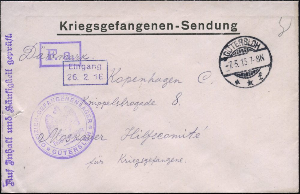 833 | 14 € | I. WELTKRIEG: KRIEGSGEFANGENENPOST 1914-18 : GÜTERSLOH/ **f 1916 (7.3.) 1K-Gitter + viol. 3K-HdN: OFFIZIER-GEFANGENENLAFER/Postprüfungsstelle.. + Ra.: F.a. (= Frist-gemäß abgefertigt) + 1L: Auf Inhalt u. Häufigkeit geprüft (links kl. Riß) klar gest. russ. Kgf.-Vordr.-Bf. n. Kopenhagen (Wo.55 a) | ![]() | |