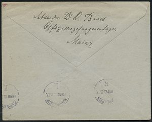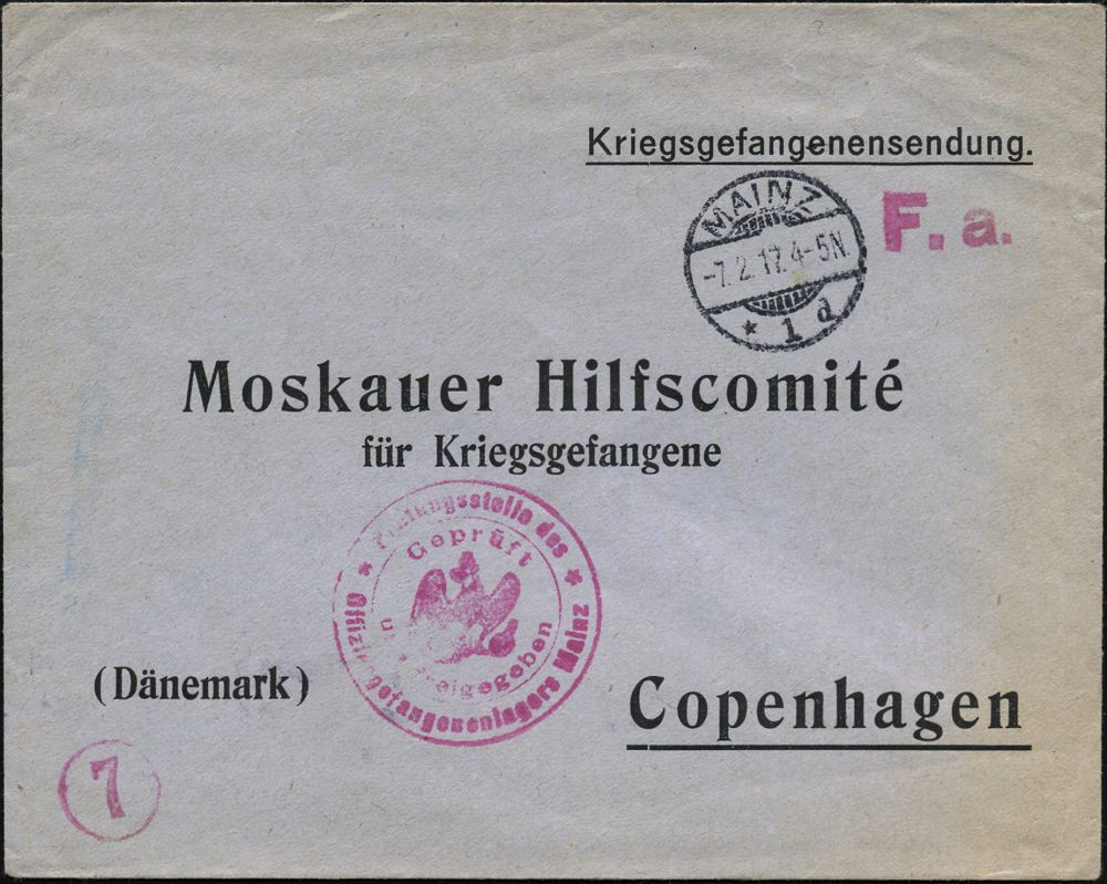 838 | 16 € | I. WELTKRIEG: KRIEGSGEFANGENENPOST 1914-18 : MAINZ/ *1d 1917 (7.2.) 1K-Gitter + roter 2K-HdN: Prüfungsstelle des/Offiziergefangenenlagers Mainz.. (Wo.10, + 50 Pkte.!) + rot: F.a. = Fristgemäß abgefertigt, Vordr.-Bf.: Moskauer Hilfscomité.. n. Kopenhagen (rs. AS) | ![]() ![]() | |