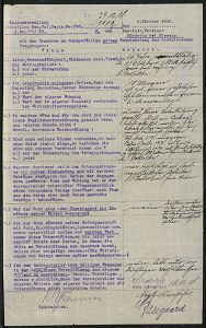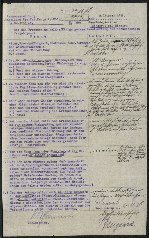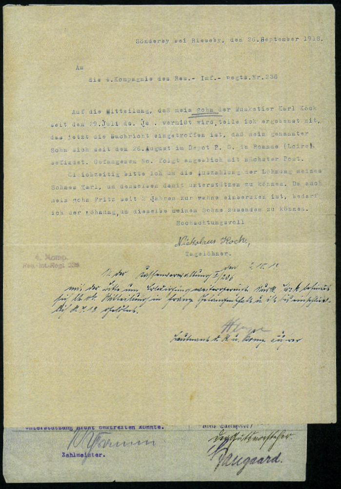841 | 25 € | I. WELTKRIEG: KRIEGSGEFANGENENPOST 1914-18 : Sönderby 1918 (26.8.) Schreiben eines Vaters an Res. Inf.-Regt. Nr. 236 über in Kriegsgefangenschaft geratene Söhne (Tagelöhner) viol. Eingangs-2L: 4. Komp./ Res.-Inf.-Regt. 236 + Aktenblatt des Regiments mit Fragebogen (= 51. Res.Div.), 2 interessante, späte Dokumente des Krieges (Formate 22 x 28,5 cm bzw. 31 x 20,5 cm) | ![]() ![]() | |