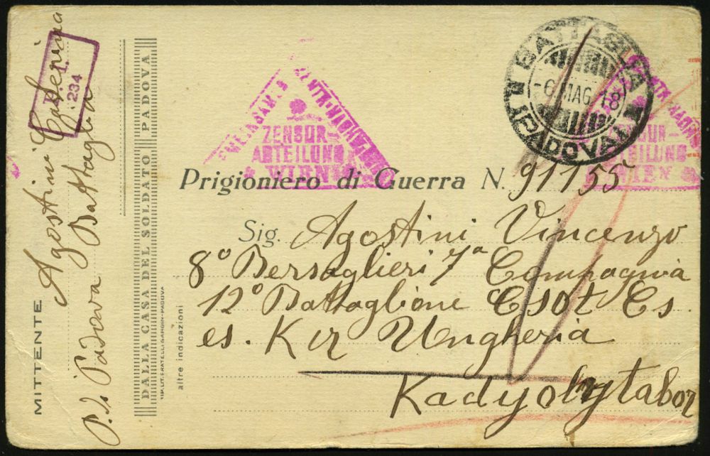 847 | 14 € | I. WELTKRIEG: KRIEGSGEFANGENENPOST 1914-18 : ITALIEN / ÖSTERREICH 1918 (6.5.) 2K-Gitter: BATTASUA/(PADOVA) + viol. Dreieck-Bd-St: ZENSUR-/ABT./WIEN + viol. Ra.2: P.I./234, Kgf.-Zensur-Kt. eines Italieners n. Ungarn | ![]() | |