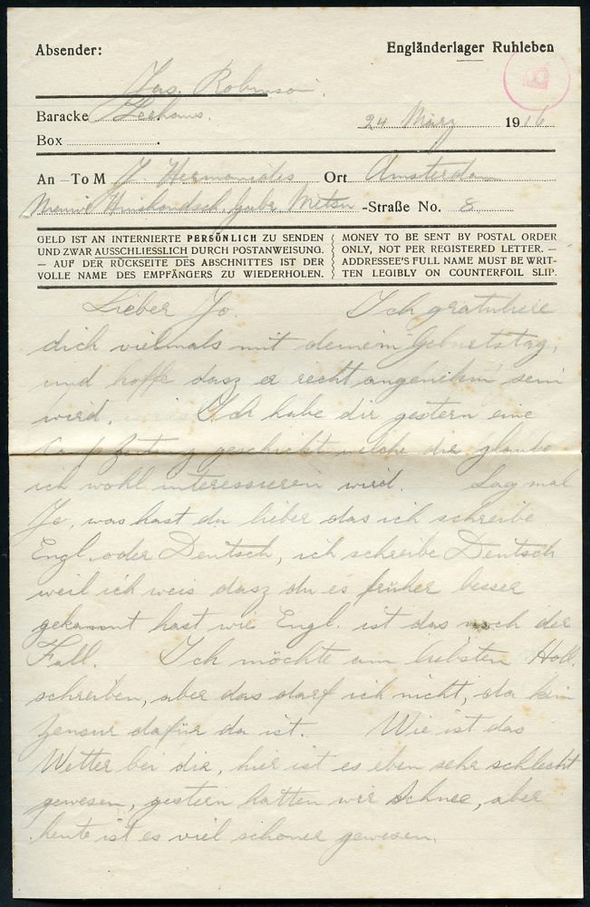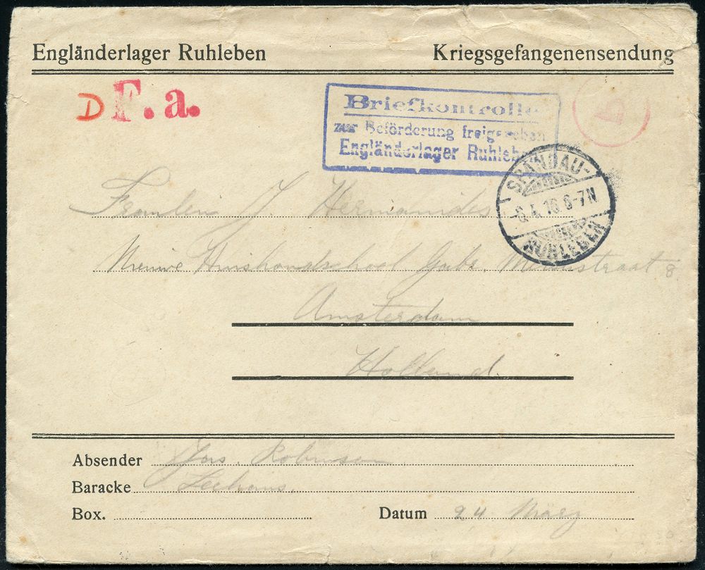 821 | 25 € | I. WELTKRIEG: KRIEGSGEFANGENENPOST 1914-18 : Berlin-Ruhleben 1916 (6.4.) 1K-Gitter: SPANDAU-/RUHLEBEN + viol. Ra.3: Briefkontrolle/zur Beförderung freigegeben/ Engländerlager Ruhleben + roter 1L: F. a., Kgf.-Vordruck-Bf.: Engländerlager Ruhleben.. (2x kl. Randrißchen) + Inhalt: Kgf.-Vordruck-Doppelbriefbogen: Engländerlager Ruhleben.. n. Holland, rs. AS., 2 Belege kompl. = selten! (Wo.12 b, viol.) | ![]() ![]() | |