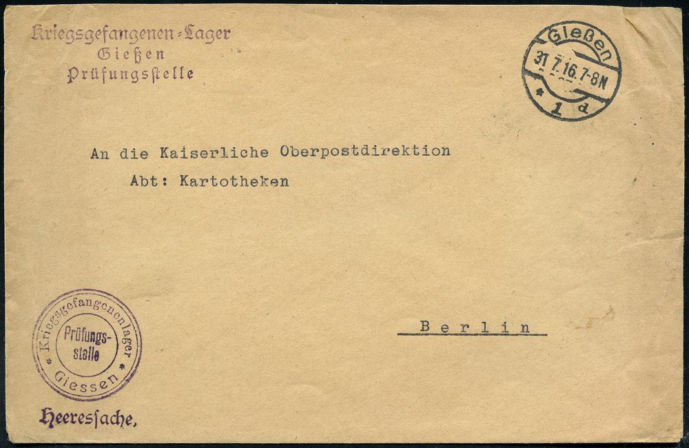 831 | 14 € | I. WELTKRIEG: KRIEGSGEFANGENENPOST 1914-18 : Gießen/ *1d 1916 (31.7.) 1K-Brücke + viol. 3K-HdN: Kriegsgefangenenlager/Prüfungs-/stelle/Giessen (auch 1x rs.)+ desgl. viol. 3L-HdN + viol. 1L: Heeressache, klar gest. Heeres-Dienst-Bf. n. Berlin | ![]() ![]() | |