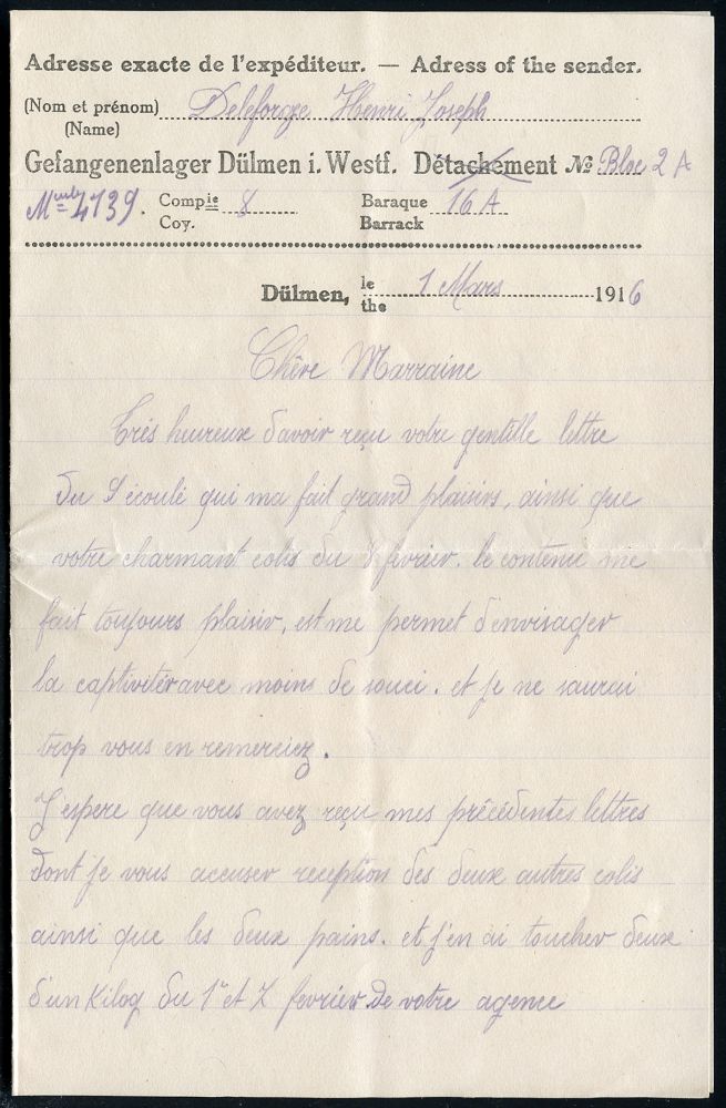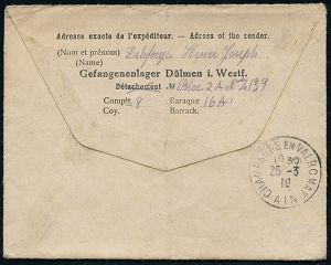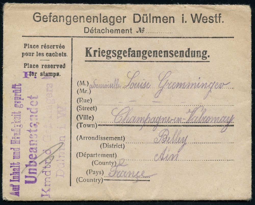829 | 25 € | I. WELTKRIEG: KRIEGSGEFANGENENPOST 1914-18 : Dülmen/ Westf. 1916 (März) Kgf.-Vordruck-Bf.: Gefangenenlager Dülmen i. Westf., Kriegsgefangenensendung + viol. Zensur-HdN: Auf Inhalt u. Häufigkeit geprüft/ Unbeanstandet.. (Wo.33 a) + Inhalt: Kgf.-Vordruck-Faltbrief eines französ. Kgf., Ausl.-Kgf.-Zensur-Bf. n. Champagne, 2 Belege komplett = selten! | ![]() ![]() ![]() | |