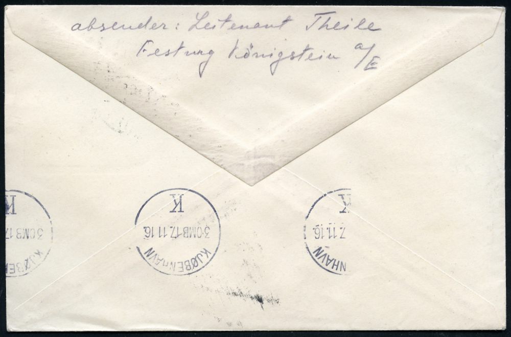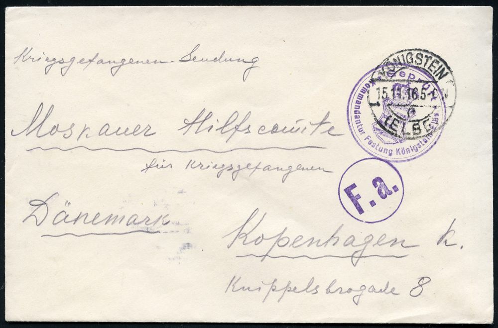 836 | 14 € | I. WELTKRIEG: KRIEGSGEFANGENENPOST 1914-18 : KÖNIGSTEIN/ c/ (ELBE) 1916 (Dez.) 1K-Brücke + viol. Zensur-2K: Geprüft/ Kommandantur Festung Königstein (sächs. Wappen) + Zensur-1K: "F.a." (Fristgemäß abgefertigt) Kgf.-Bf an Moskauer Hilfscomité (hs. Abs. russ. Oberst) n. Kopenhagen (Wo.79 d) | ![]() | |