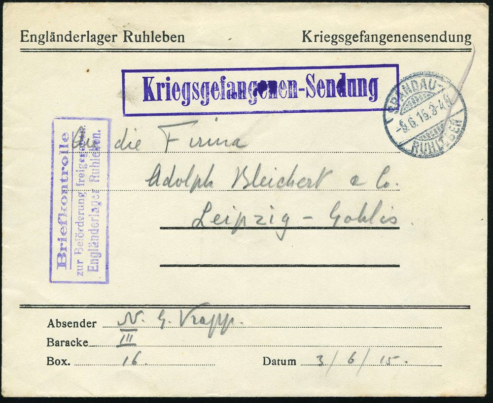 822 | 18 € | I. WELTKRIEG: KRIEGSGEFANGENENPOST 1914-18 : Berlin-Ruhleben 1915 (9.6.) 1K-Gitter: SPANDAU-/RUHLEBEN auf Vordr-Bf: Engländerlager Ruhleben + viol. Zensur-Ra.3.: Briefkontrolle/..freigegeben/ Engländerlager Ruhleben (Wo.121 b / viol.) Inl.-Kgf.-Bf. (ohne Inhalt) n. Leipzig | ![]() | |