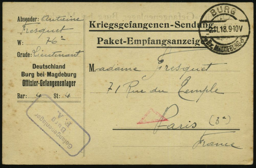 827 | 25 € | I. WELTKRIEG: KRIEGSGEFANGENENPOST 1914-18 : BURG/ *Bz.MAGDEBURG/ b 1918 (2.11./8.11.) 1K-Brücke + bl. Ra.3: Gefangenenlager/Burg/F.A. + stummes Dreieck (Wo.18) 2 Kgf.-Vordr.-Ktn: Burg../Offz.-Gef.Lager, 2 Belege von einem Abs.! ,8.11. = letzter Kriegstag, ein Tag v o r Waffenstillstand!, sehr späte Kgf.-Ktn. n.Paris!, 2 Belege! (8.11. Erzberger beginnt Verhandlungen!) | ![]() ![]() ![]() | |