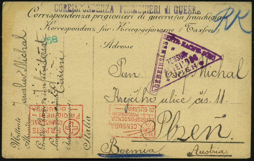 846 | 15 € | I. WELTKRIEG: KRIEGSGEFANGENENPOST 1914-18 : ITALIEN / ÖSTERREICH 1916 (9.12.) Kgf.-Vordr.-Kt eines Tschechen in ital. Lager Ciarini !, roter R.K.-Ma.St: CENSURA/ CORRISP./ PRIGIONI/DI GUERRA.. (Stern + Rotes Kreuz) + österr. Dreiecks-Zensur-HdN: ..ZENSUR-/ABT./ WIEN (Wo.1 a) n. Pilsen | ![]() | |