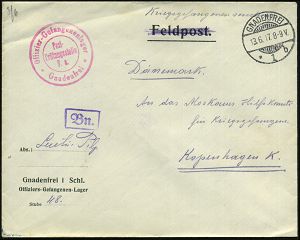 832 | 18 € | I. WELTKRIEG: KRIEGSGEFANGENENPOST 1914-18 : GNADENFREI/ *1b 1917 (13.6.) 1K-Gitter + roter 2K-HdN: Offiziers-Gefangenenlager/Post-/Prüfungsstelle/F. + viol. Prüfer-Ra.: "B n.", Vordr.Bf.: Gnadenfrei i Schl./ Offiziers-Gefangenen-Lager ("Feldpost" gestrichen) n. Kopenhagen | ![]() | |