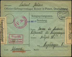 842 | 20 € | I. WELTKRIEG: KRIEGSGEFANGENENPOST 1914-18 : REISEN/ (Kr.LISSA) 1917 (9.6.) 1K-Brücke auf Vordr.-Bf.: Offizier-Gefagenenlager Reisen in Posen.. + 2x schw. Verschluß-zettel: Kriegsgefangenenlager/Reisen i.Posen (Wo. unbekannt!) roter Ra.3: Geprpft/Gefangenenlager/Reisen i.Posen (Wo.120 b) + 1K: KRIEGSGEFANGENENLAGER/F.a./REISEN I/POSEN, seltener Ausl.-Bf. (n. Kopenhagen) | ![]() ![]() | |