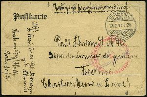 826 | 15 € | I. WELTKRIEG: KRIEGSGEFANGENENPOST 1914-18 : BREHNA/ (KR BITTERFELD) 1917 (24.2.) 1K-Gitter + viol. Zensur-2L: Geprüft/ Überwachungsstelle + roter französ. Eingangs-Zensur-2K: VISÉ / DEPOT DES PRISONNIERS DE GUERRE/ 4e Région CHARTRES (Wo.28) Kgf.-Doppel-Zensur-Kt. an deutschen Kgf. | ![]() | |