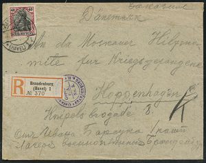 825 | 20 € | I. WELTKRIEG: KRIEGSGEFANGENENPOST 1914-18 : BRANDENBURG/ *(HAVEL)1i 1917 (6.7.) 1K-Brücke auf EF 40 Pf. Germania + gez. RZ: Brandenburg/(Havel) 1 + viol. Zensur-2K: GEPRÜFT/F.A./Gefangenen/Lager/BRANDENBURG a-H., Ausl.-R-Bf. an Moskauer Hilfscomité Kopenhagen , rs. AS (Mi.90 II , EF) | ![]() ![]() | |