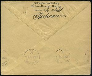 820 | 28 € | I. WELTKRIEG: KRIEGSGEFANGENENPOST 1914-18 : BAUTZEN/ *1a 1915 (4.7.) 1K-Gitter + grüner Zenur-Ra.: Kriegsgefangenen-Sendung../Postverkehr-PRÜFUNGSSTELLE/Geprüft.. + grüner, kleiner 1K: F. a., rs. Abs.-Vordruck: Gefangenen-Abteilung, Barbara-Kaserne, Bautzen.., Kgf.-Ausl.-Bf. n. Copenhagen, rs. AS. (Wo,8 b, grün = seltene Farbe!) | ![]() ![]() | |