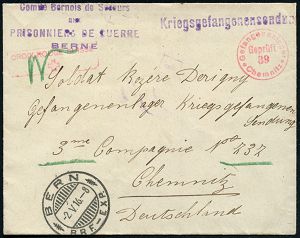 828 | 20 € | I. WELTKRIEG: KRIEGSGEFANGENENPOST 1914-18 : Chemnitz 1916 (Mai) roter, kleiner Zensur-1K: Chemnitz/Gefangenenlager/Geprüft/39 = Wolter unbekannt ! + roter Ra.: CROIX-ROUGE SUISSE + viol. 4L: Comité Bernois../PRISONNIERS DE GUERRE/BERNE etc., Kgf.-Zensur-Bf. aus der Schweiz n. Chemnitz | ![]() | |