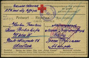 852 | 12 € | I. WELTKRIEG: KRIEGSGEFANGENENPOST 1914-18 : RUSSLAND / ÖSTERREICH 1917 (Feb.) Rotkreuz-Vordr.-Karte (Antwort) aus sibirischem Lager Beresovka (Transbaikal), russ. + österr.Zensur-HdN (Wien) n. Wien | ![]() | |