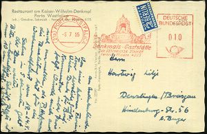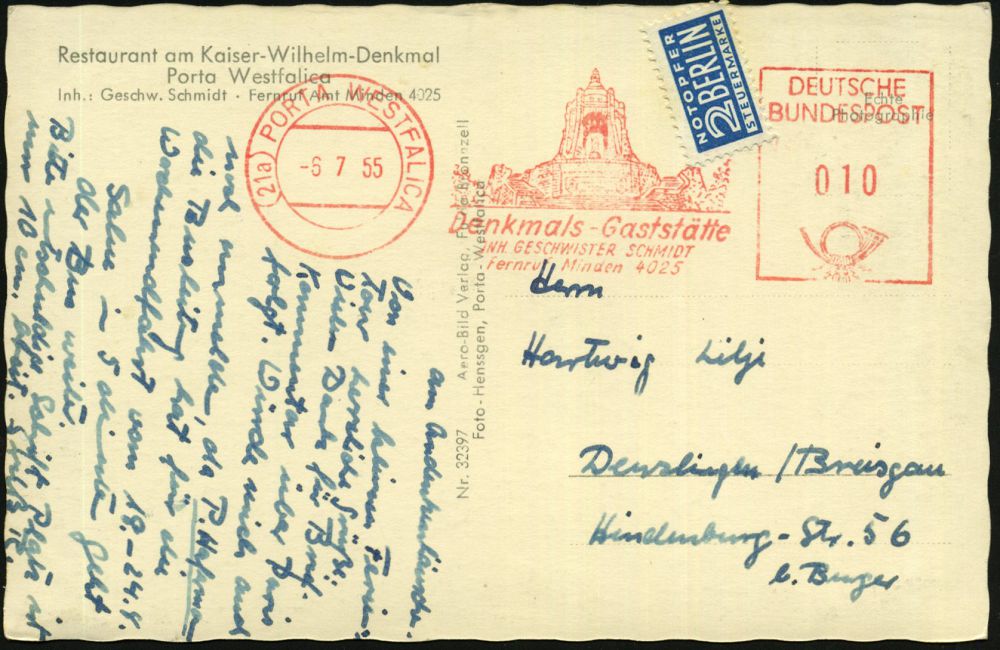 34 | 18 € | DEUTSCHE GESCHICHTE 1871 - 1914 : (21a) PORTA WESTFALICA/ Denkmals-Gaststätte/ JNH.GESCHW.SCHMIDT 1955 (6.7.) AFS Postalia = Kaiser Wilhelm I.-Denkmal = Hauspostamt Ausflugs-Lokal , motivgl. s/w.-Foto-Ak.: Wilhelm I.-Denkmal = Fremdnutzung Firmen-Freistempels durch einen Gast, Bedarf (Dü.E-23 B) | ![]() ![]() | |