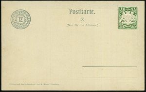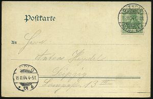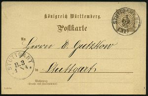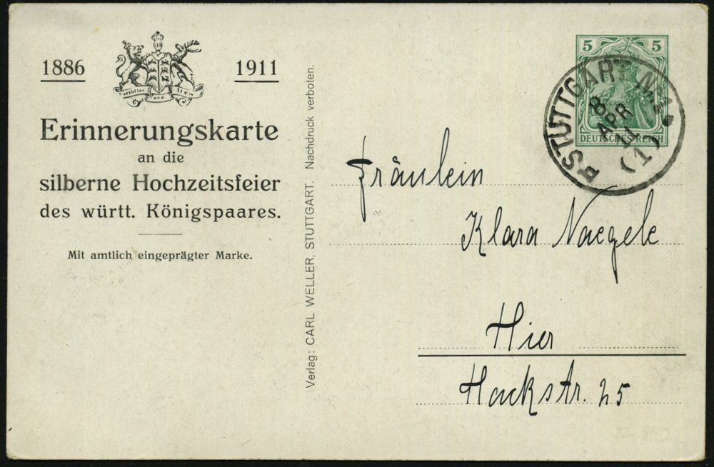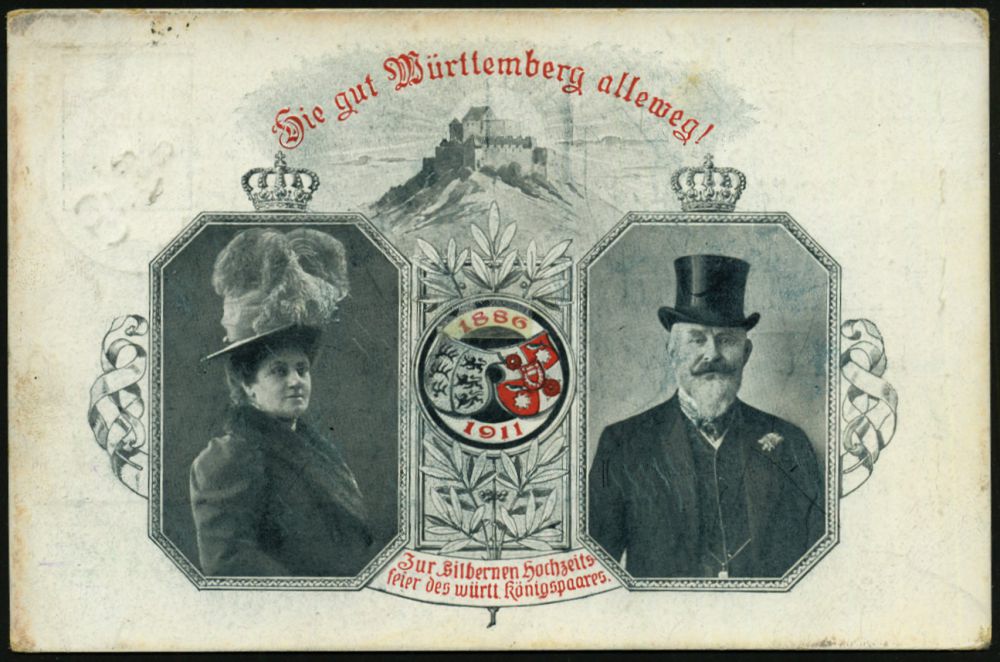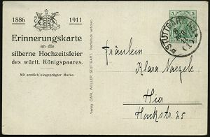 39 | 18 € | DEUTSCHE GESCHICHTE 1871 - 1914 : Stuttgart Nr.1 1911 (8.4.) 1K auf PP 5 Pf. Germania, grün: Silberhochzeit des Württbg. Königspaares (2 Kronen, Burg, Wappen, Königspaar in Zivil mit Hüten) Bedarf (Mi.PP 27/C 106-03) | ![]() ![]() | |