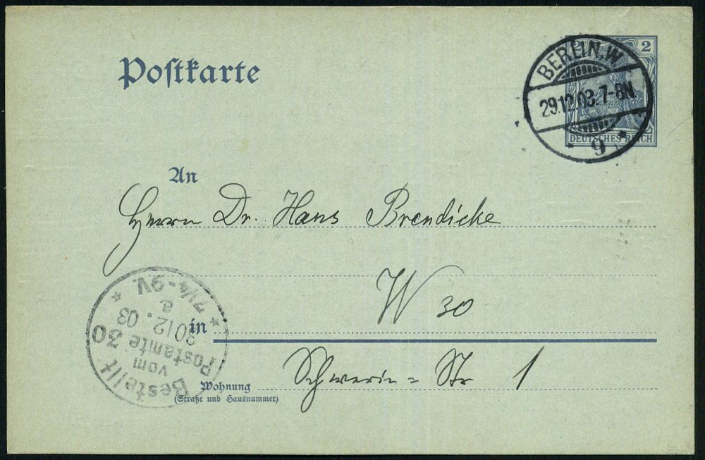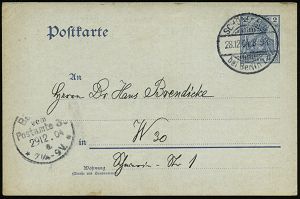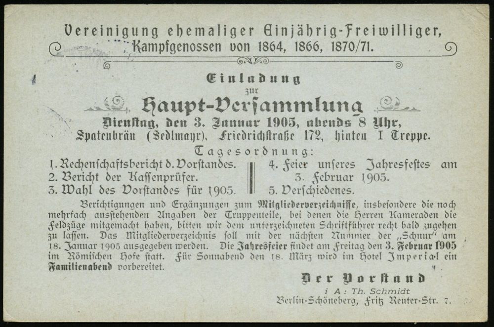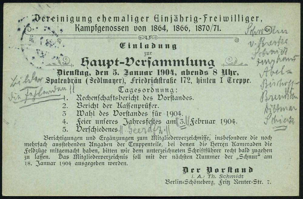 9 | 15 € | DEUTSCHE GESCHICHTE 1871 - 1914 : BERLIN,W./ *9* 1903 (29.12.) 1K-Gitter auf Orts-P 2 Pf. Germania + Zudruck Veteranen-Verein "Einjähriger Freiwilliger" von 1864, 1866 u. 1870/71.. (= Einladung zur Hauptversammlung, hs. Namenszusätze) Ortskt. (Mi.PZD 63X) | ![]() ![]() | |