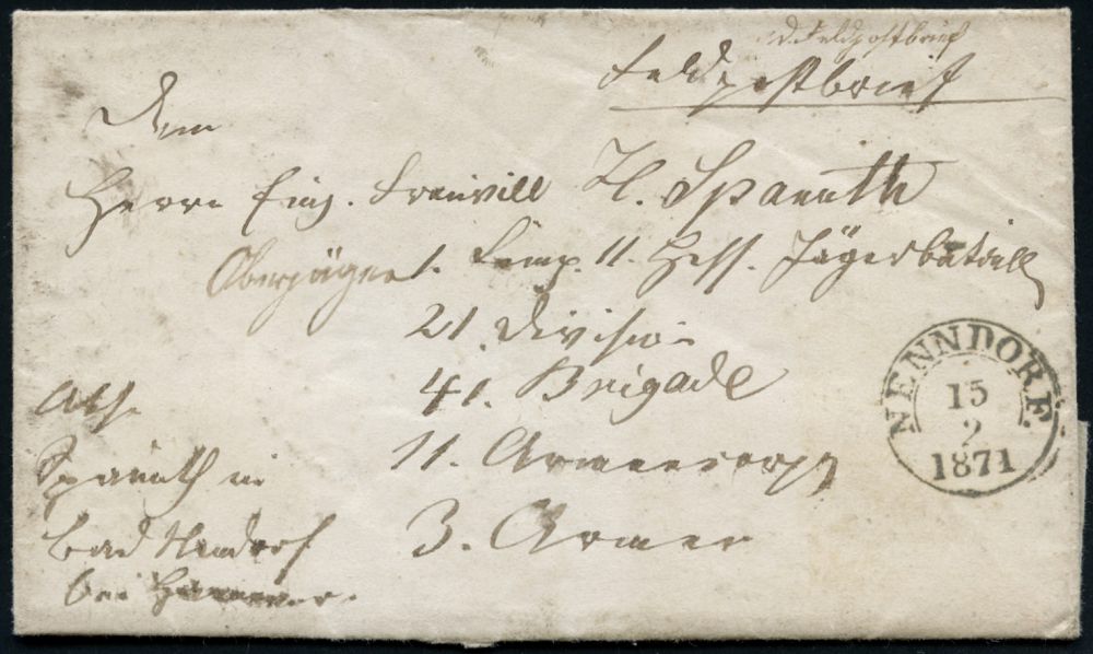 31 | 25 € | DEUTSCHE GESCHICHTE 1871 - 1914 : NENNDORF 1871 (15.2.) 1K = nachverwendeter Th.& Taxis-2 auf Feldpost-Bf. (Heimat - Front) an .II. Hess. Jäger-Btl., 21. Div. mit Inhalt! = 3. deutscher Einigungskrieg | ![]() | |