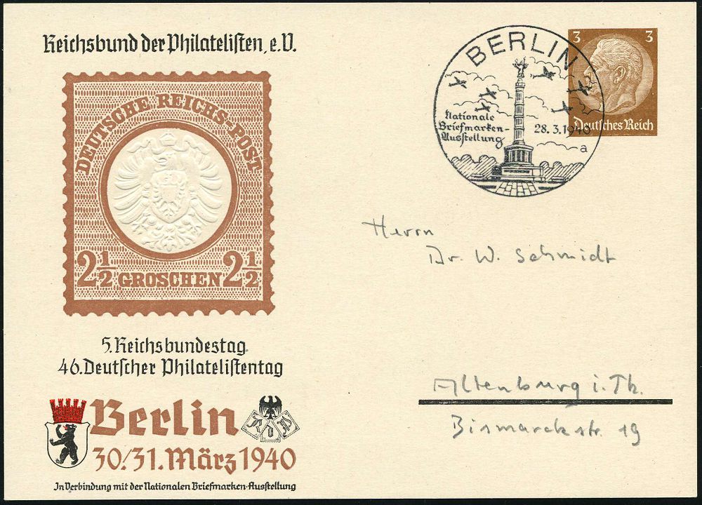 13 | 18 € | DEUTSCHE GESCHICHTE 1871 - 1914 : BERLIN/ Nationale/ Briefmarken-/ Ausstellung/ g 1940 (30.3.) SSt mit UB "a" = Siegessäule deutsch-französ. Krieges 1870/71 auf PP 3 Pf. Hindenbg.: 46. Deutscher Philatel.Tag (Brustschildmarke 2 1/2 Gr.) = 1. Marke Deutschen Reich! (Mi.PP 122/C 104-04) Inl.Karte (Bo.322 a) | ![]() | |