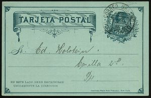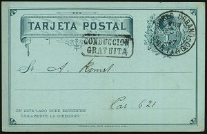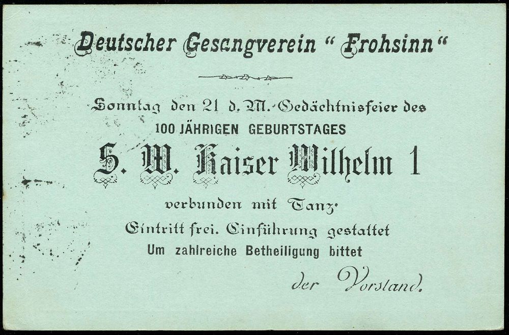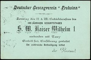 63 | 18 € | DEUTSCHE GESCHICHTE 1871 - 1914 : CHILE 1897 (18.3.) amtl. Inl.-P 1 C. Columbus, grün + rs. Zudruck: Deutscher Gesangsverein "Frohsinn" Gedächtnisfeier, 100 JÄHR. GEBURTSTAG, S.M. Kaiser Wilhelm 1 (verbunden mit Tanz) 1K: CORREO URBANO/SANTIAGO + Ra.2: CONDUCCION/ GRATUITA, Ortskt. | ![]() ![]() | |