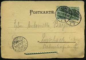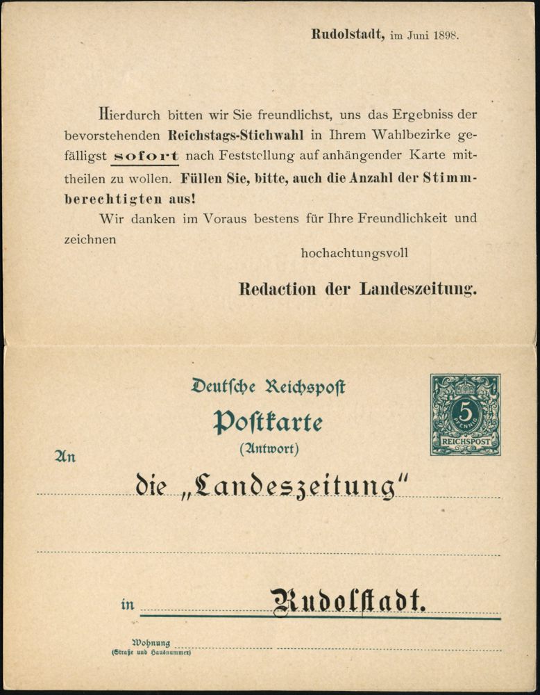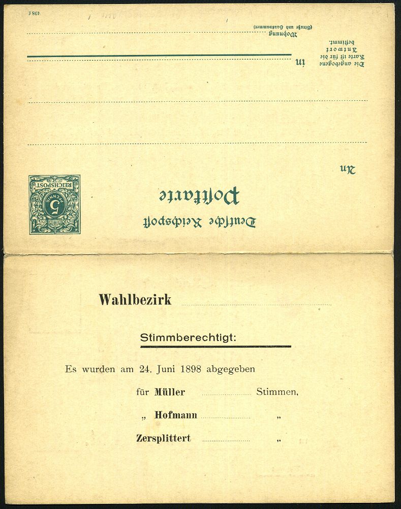 35 | 20 € | DEUTSCHE GESCHICHTE 1871 - 1914 : Rudolstadt 1898 (24.6.) Inl.-P Ziffer 5 Pf. + 5 Pf. grün mit Antwort + Zudruck zur Reichstagswahl v.24.Juni (Auswerung der Stimmenzahl) Klappkt. an die "Landeszeitung" adressiert, ungebr. (Mi.PZD 31) | ![]() ![]() | |