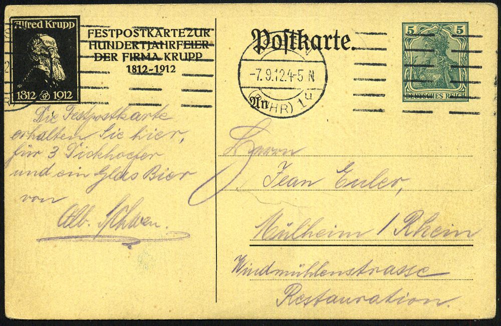 20 | 25 € | DEUTSCHE GESCHICHTE 1871 - 1914 : ESSEN/ (RUHR) 1/ u 1912 (7.9.) Band-MaSt. auf PP 5 Pf. Germania, grün: HUNDERTJAHRFEIER FIRMA KRUPP (Arbeiter, Krupp-Denkmal) Bedarf!, Krupp größter Rüstungs-Produzent des I./II. Weltkrieges! (Mi.PP 27/C 140-01) | ![]() ![]() | |