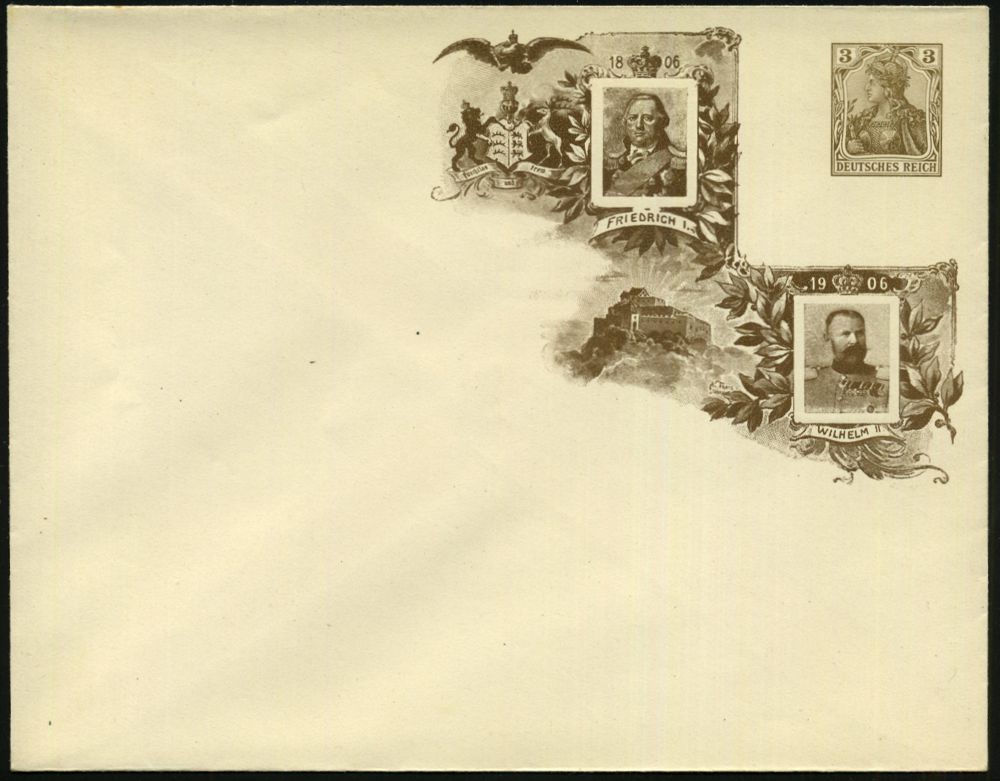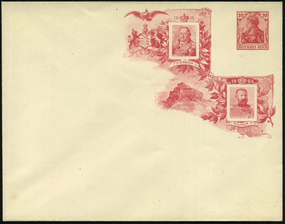 54 | 50 € | DEUTSCHE GESCHICHTE 1871 - 1914 : DEUTSCHES REICH 1906 PU 2 Pf., 3 Pf. 5. Pf., 10 Pf. u. 20 Pf. Germania: "Reg.Jubiläum Friedrich I." 1806 - 1906 = König v. Napoleons Gnaden (Rheinburnd) Abb: Friedr.I., Wilhelm II v.Baden, Wappen, Burg Hohenzollern, alle ungebr. ,5 Belege, kompl.!, selten kompl. angeboten! (ME.PU 23 bis PU 27/D 3) | ![]() ![]() ![]() ![]() ![]() | |
