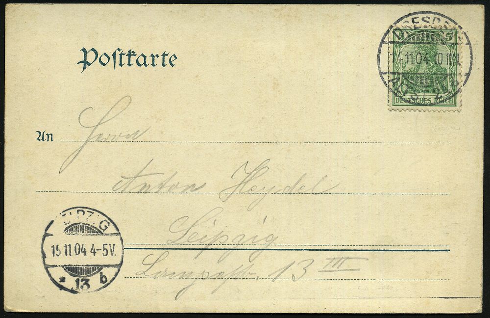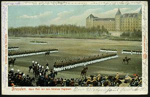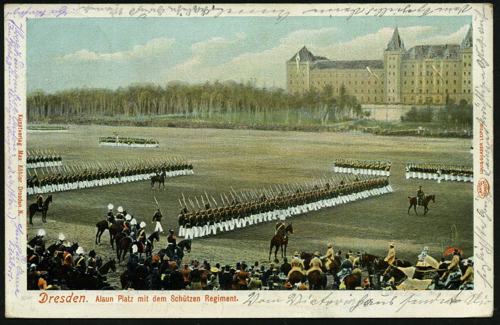 16 | 18 € | DEUTSCHE GESCHICHTE 1871 - 1914 : DRESDEN-/ ALTST.24/ b 1904 (14.11.) 1K-Gitter auf Color-Ak.: Alaunplatz mit dem Schützen-Regiment = 108. Füs. Regt. "Prinz Georg" bei einer Parade (vor Schützen-Kaserne Dresden) im I. Weltkrieg in Belgien, beteiligt am "Massaker von Dinant" (1914) etc., seltene Fern-Kt. (Mi.70) | ![]() ![]() | |