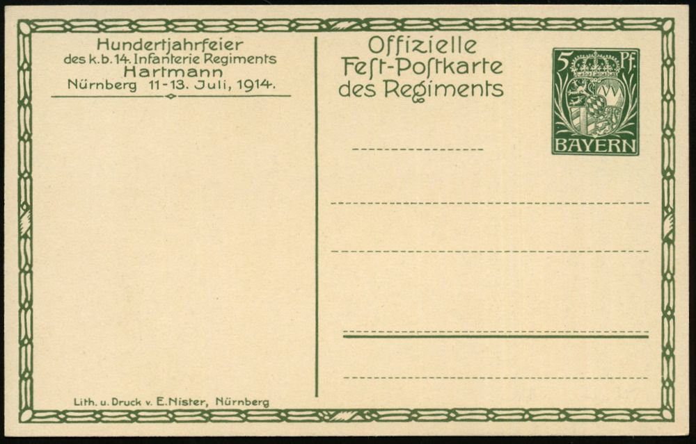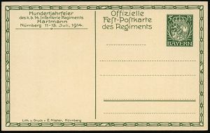 33 | 25 € | DEUTSCHE GESCHICHTE 1871 - 1914 : Nürnberg 1914 (Juli) PP 5 Pf. Huppwappen, grün: 100-Jahrfeier 14. Inf. Regt.Hartmann (Nürnberg): Angriff des III. Bataillons durch die Weinberge bei Weißenburg 4.8.1870 (sign. Anton HOFFMANN) ungebr. (Frech.PP 38/C 16-06) | ![]() ![]() | |