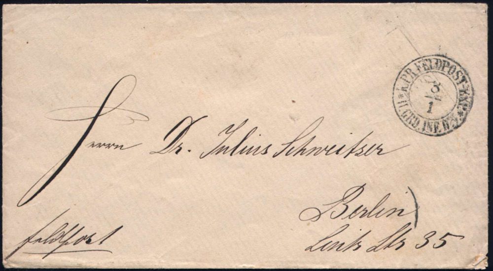 41 | 20 € | DEUTSCHE GESCHICHTE 1871 - 1914 : PREUSSEN 1871 (8.1.) Feldpost-2K: K.PR. FELDPOST-EXPED/*II. GRD. INF. DIV.* , klar gest. Feldpost-Bf. n. Berlin (rs. AS) rs. Abs.: "6 Comp. Kaiser Franz" | ![]() | |