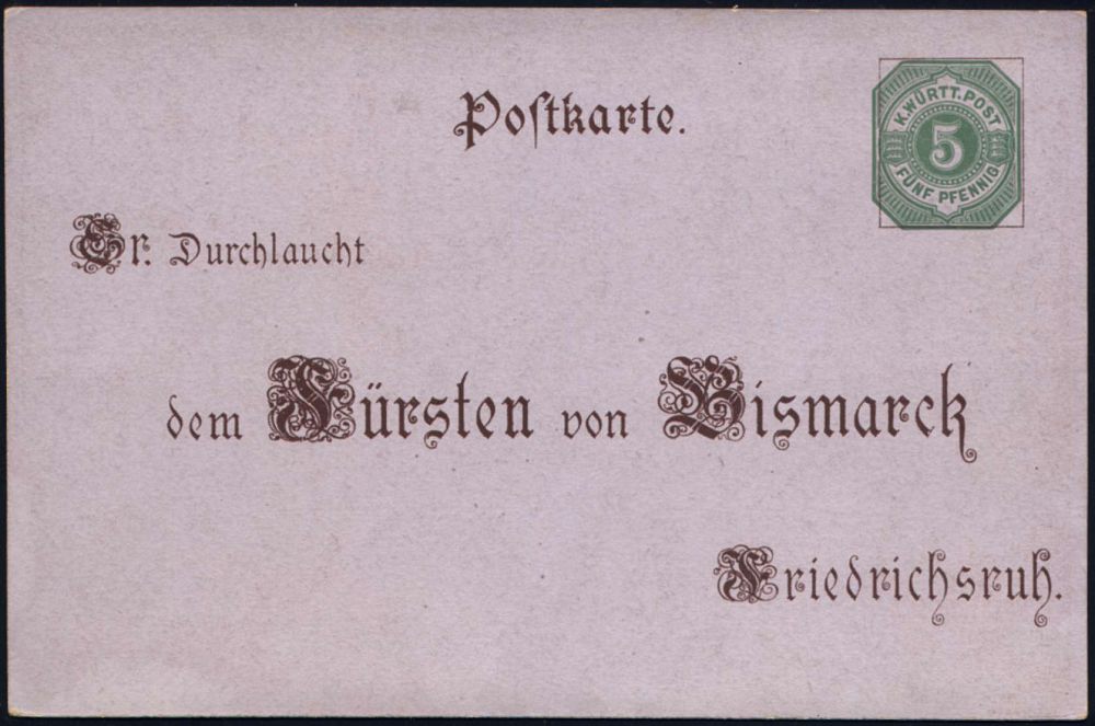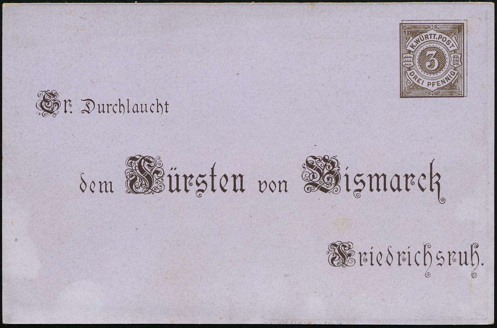 38 | 25 € | DEUTSCHE GESCHICHTE 1871 - 1914 : STUTTGART Nr.1 1895 (1.4.) 1K auf Württemberg PP 3 Pf. Ziffer braun: Zum 80.Geburtstagsfest/1815 - 1895 = Bismarck-Brustbild in b l a u ,seltene Bedarfs-Ortskt., (Frech.PP 10/C 2-02) | ![]() ![]() | |