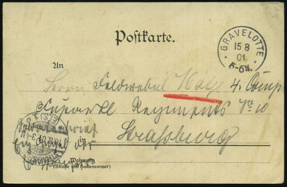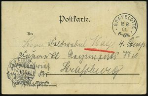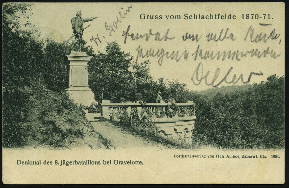22 | 15 € | DEUTSCHE GESCHICHTE 1871 - 1914 : GRAVELOTTE/ ** 1901 (15.8.) 1K auf s/w.-Foto-Ak.: Gruss vom Schlachtfelde 1870-71 = Denkmal 8. Jäger-Btl. , portofreie Soldatenkt. an Fuß-Artl.-Rgt. No.10 in Straßburg | ![]() ![]() | |