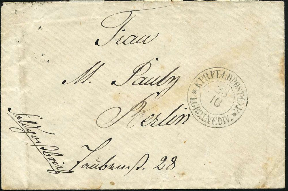 40 | 23 € | DEUTSCHE GESCHICHTE 1871 - 1914 : PREUSSEN 1870 (23.10.) seltener 2K: K PR FELDPOST-EXP./* 1. GRD. INF. DIV.* , klar gest. dekorativer, kleiner Feldpost-Bf. (rs. etw. fleckig) n. Berlin (Feu.193 II. Verwendung) | ![]() | |