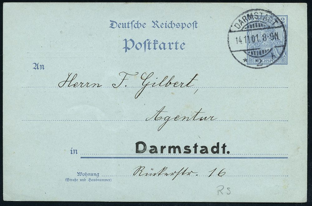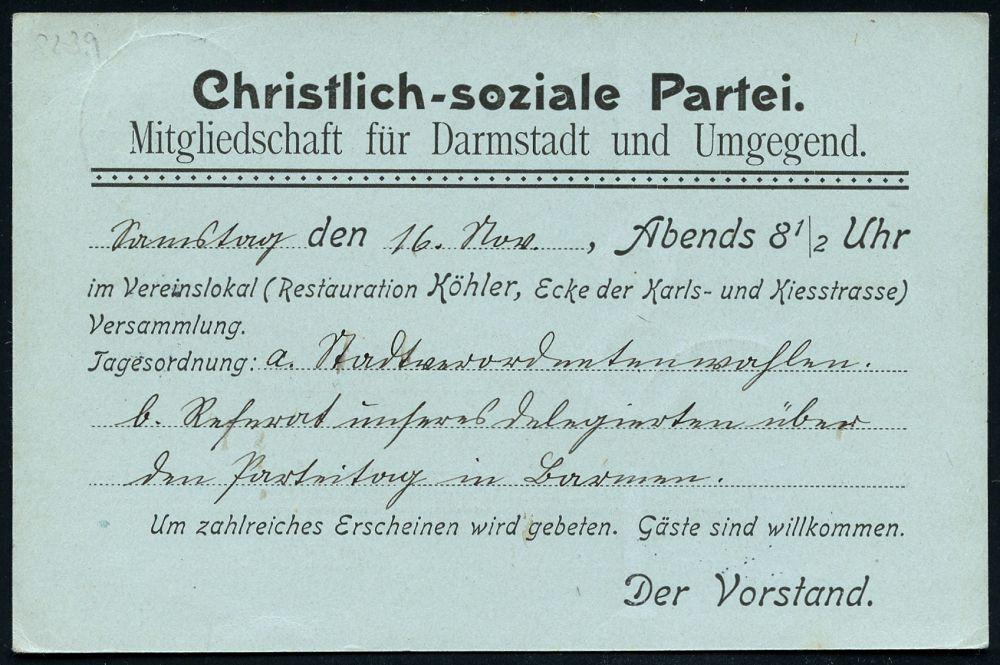15 | 18 € | DEUTSCHE GESCHICHTE 1871 - 1914 : DARMSTADT/ *2b 1901 (14.11.) 1K-Gitter auf amtl. Orts-P. 2 Pf. Germania + rs. Zudruck: Christlich-soziale Partei.. Darmstadt (Einladung zur Versammlung) Bedarf | ![]() ![]() | |