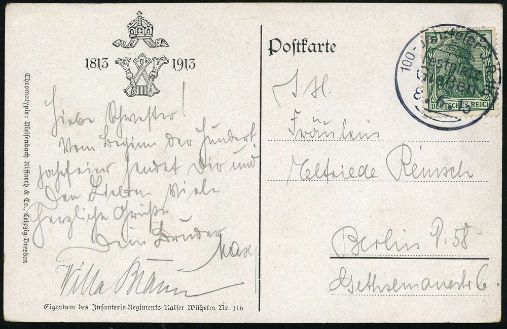 21 | 35 € | DEUTSCHE GESCHICHTE 1871 - 1914 : Gießen/ Festplatz/ 100-Jahrfeier J.R.116 1913 (8.6.) seltener SSt mit seltener "Groß- u. Kleinschreibung" im Orts auf Jubil.-Künstler-Sonder-Kt.: Jnf. Rgt. 116 = 100 Jahre (= Szene aus deutsch-französ. Krieg 1870-71, sign.H. Dietz) Bedarfs-Kt. (Bo.2 , nur 2 Tage verwendet!) | ![]() ![]() | |