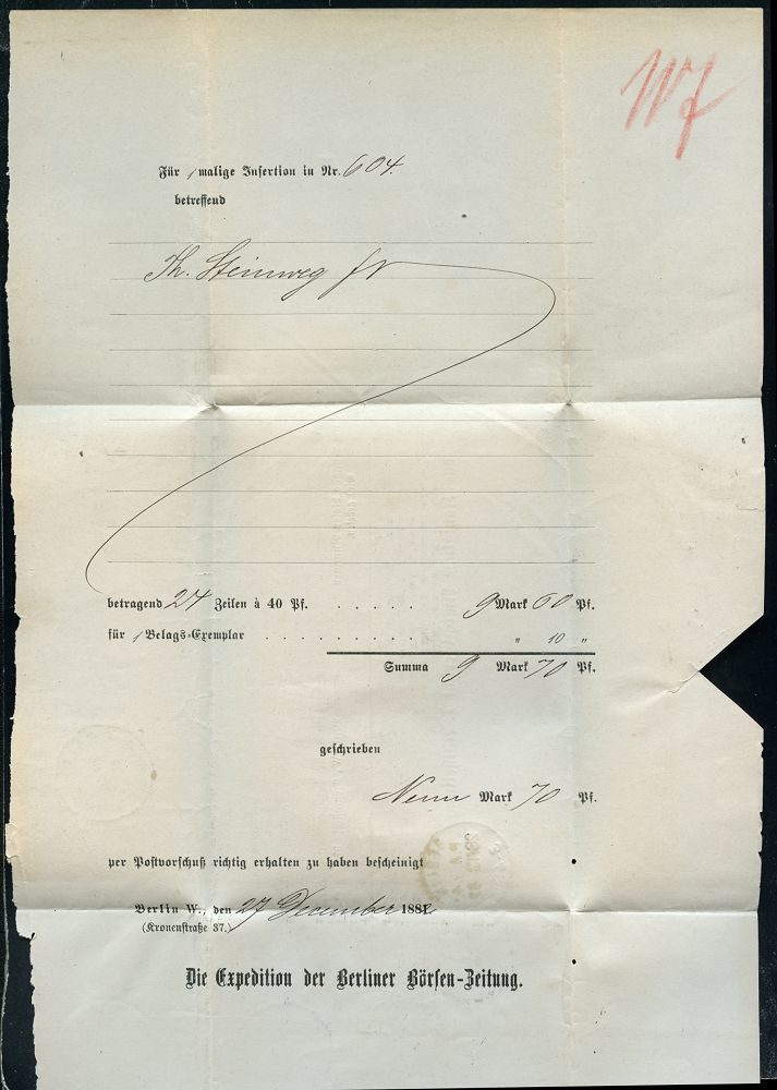 2 | 18 € | DEUTSCHE GESCHICHTE 1871 - 1914 : BERLIN/ P.A.40 1882 (28.12.) 1K auf NN-Firmen-Bf: Berliner Börsen-Zeitung m i t Inhalkt: Insertions-Rechnung , früher lila NN-Zettel ("70 Pf.") n. Calbe, rs. AS. (BHW.633, + 40.-DM) | ![]() ![]() | |