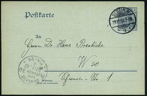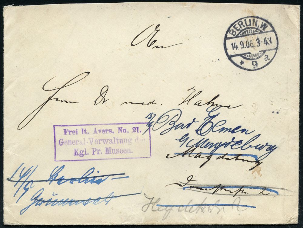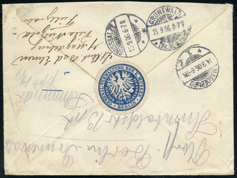 11 | 25 € | DEUTSCHE GESCHICHTE 1871 - 1914 : BERLIN,W./ *9a 1906 (14.9.) 1K-Gitter + viol. Ra3: Frei lt. Avers No. 21./General-Verwaltung/Kgl. Pr. Museen = Verwaltung der Museumsinsel mit Pergamon- u. "Neuem Museum" etc. , rs. blaue Siegeloblate: GENERAL-VERWALTUNG DER K. MUSEEN, MUSEUM FÜR VÖLKERKUNDE, nachgesandter Fern-Bf., rs. 3 verschiedene TS./AS. | ![]() ![]() | |