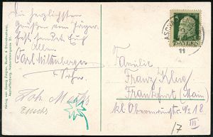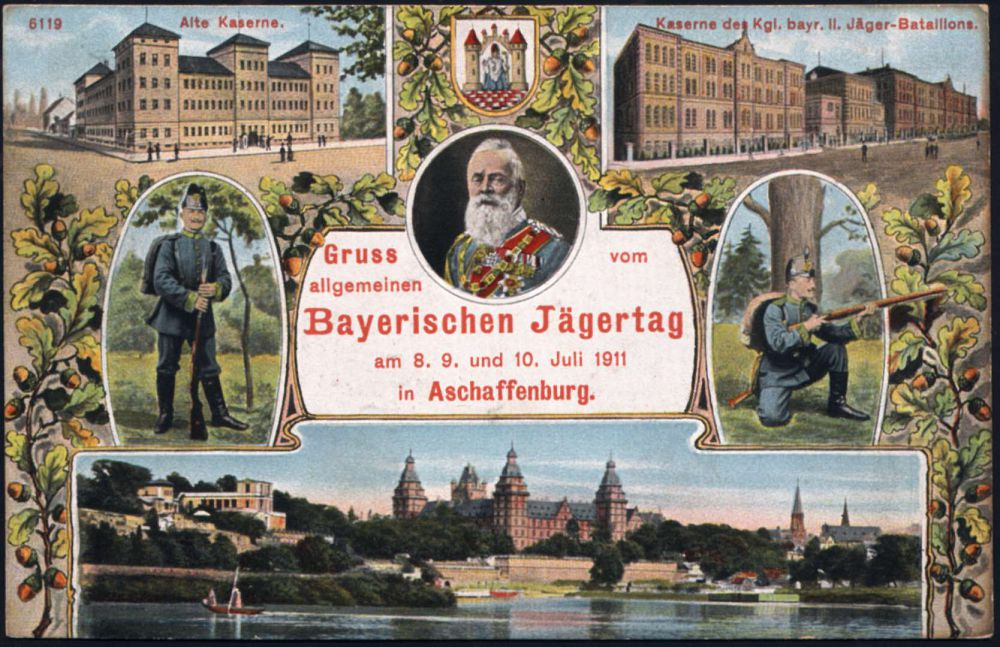 1 | 16 € | DEUTSCHE GESCHICHTE 1871 - 1914 : ASCHAFFENBURG 2 1911 (9.7.) 1K auf Color-Jubil.-Ak.: "Gruss v. allgem. Bayer. Jägertag/am 8. 9. u.10 Juli 1911" (Schloß, 2 Kasernen, 2 Jäger in Uniform etc.) Bedarf (Mi.77 EF) | ![]() ![]() | |