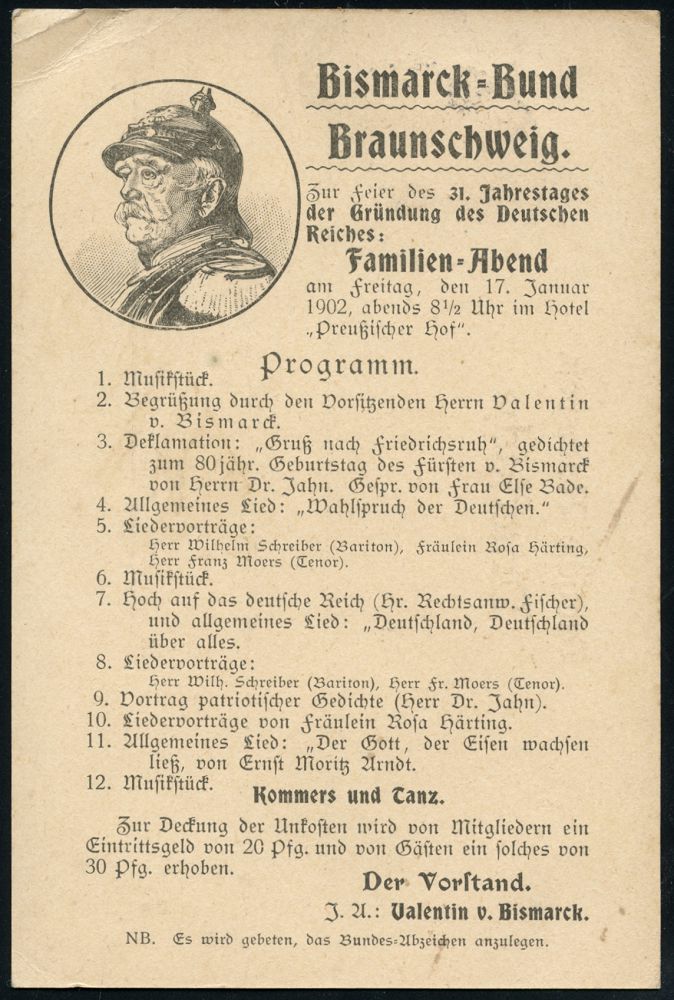14 | 16 € | DEUTSCHE GESCHICHTE 1871 - 1914 : BRAUNSCHWEIG/ 1 1902 (13.1.) 1K-Gitter auf illustrierter Einladungskarte: Deutscher Bismarck-Bund.. Vortrag mit 100 Riesen-Lichtbildern../ J.A. Valentin von Bismarck = Bismarck-Medaillon, seltene Ortskt. (Mi.52 EF) | ![]() ![]() | |