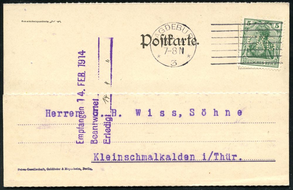 28 | 16 € | DEUTSCHE GESCHICHTE 1871 - 1914 : Magdeburg 3 1914 (13.2.) EF 5 Pf. Germania mit Firmenlochung: "F K G" = F riedrich Krupp-Gruson auf Firmenkt. kurz vor dem I. Weltkrieg!, rs. viol. Abs.-3L, Krupp & Gruson = Technik- u.Waffen-Pioniere! (Mi.85 I Perfin) | ![]() ![]() | |